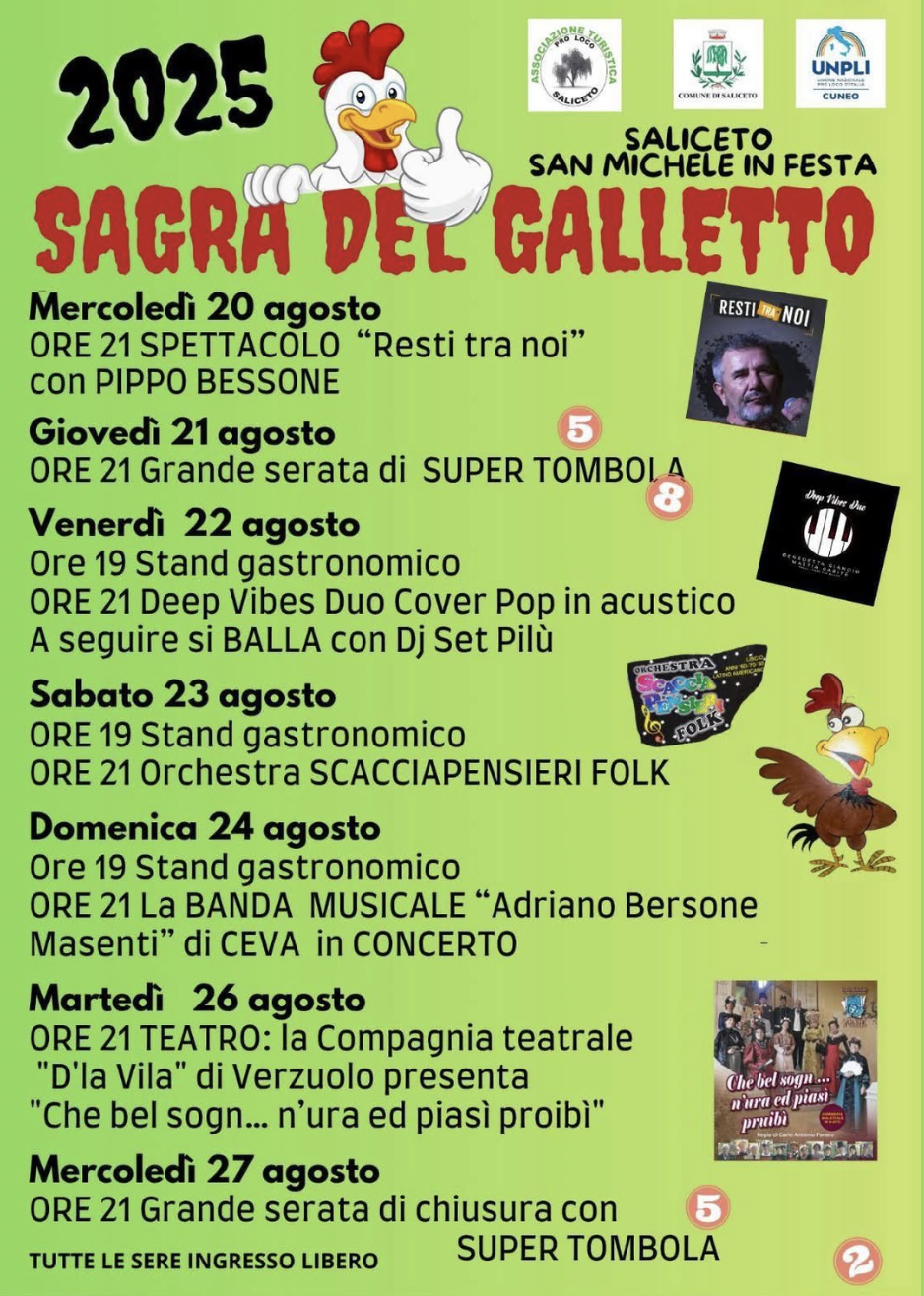 Organizzata dal Gruppo festeggiamenti San Michele in collaborazione con la Pro Loco, la tradizionale "Sagra del Galletto" in programma dal 20 al 27 settembre, mette assieme buon cibo, spettacoli e musica per tutti i gusti e tutte le età. Il nutrito programma è coronato dalle serate dedicate alla tombola e Super Tombola.